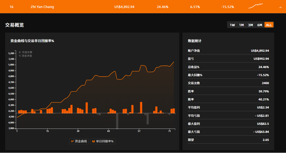 让我们将目光从前十排行中挪开,放在紧跟其后的后起之秀上。领先的参赛者看似稳坐高台,但实际上后面还有很多交易者在奋起直追。今天我们要关注的便是目前排名第16的Zhi Yan Chang。