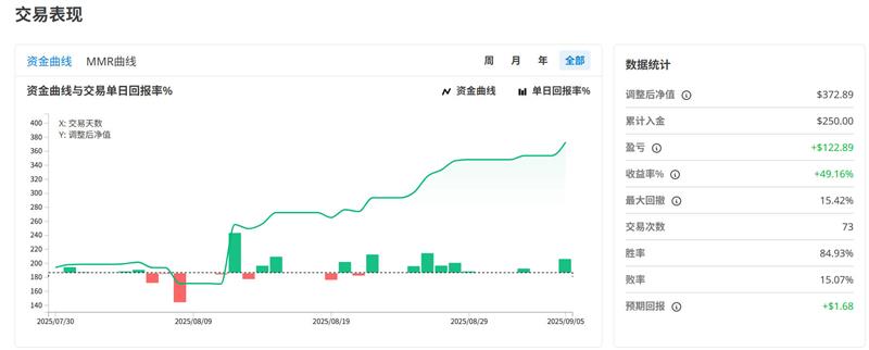 - 资金基数小:目前账户余额不足400美金,收益率虽高,但放在更大资金下是否依旧稳健,还需时间验证。