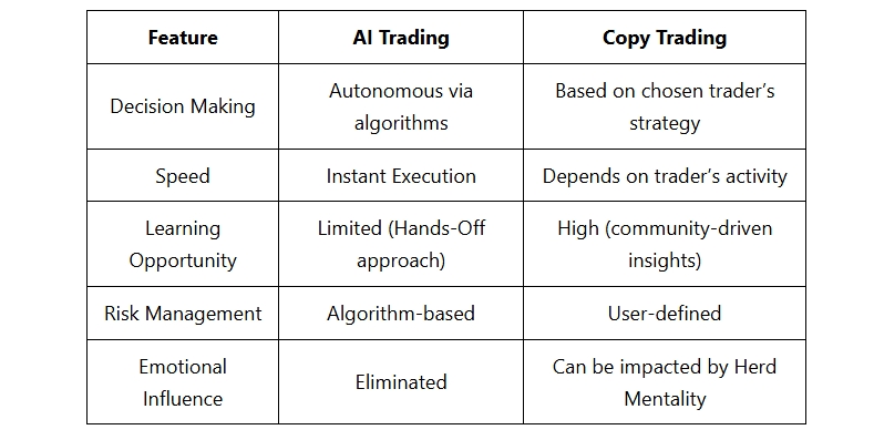 While both AI trading and copy trading leverage technology to simplify trading, their approaches differ significantly. Here’s a detailed comparison to help you understand which method suits your needs:
