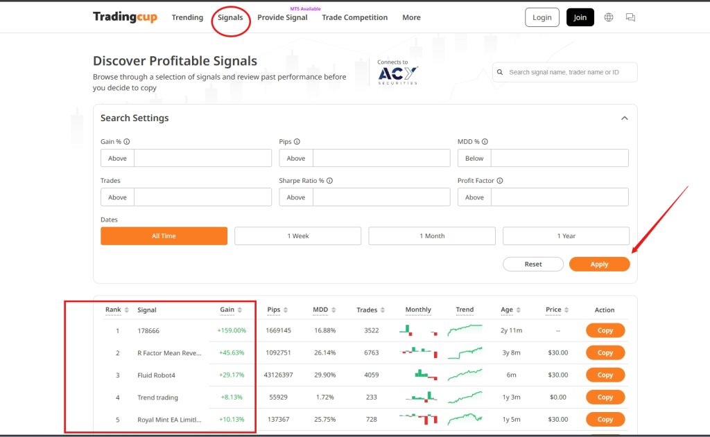 At Tradingcup, you can browse through a selection of signals and review past performance before you decide to copy.
