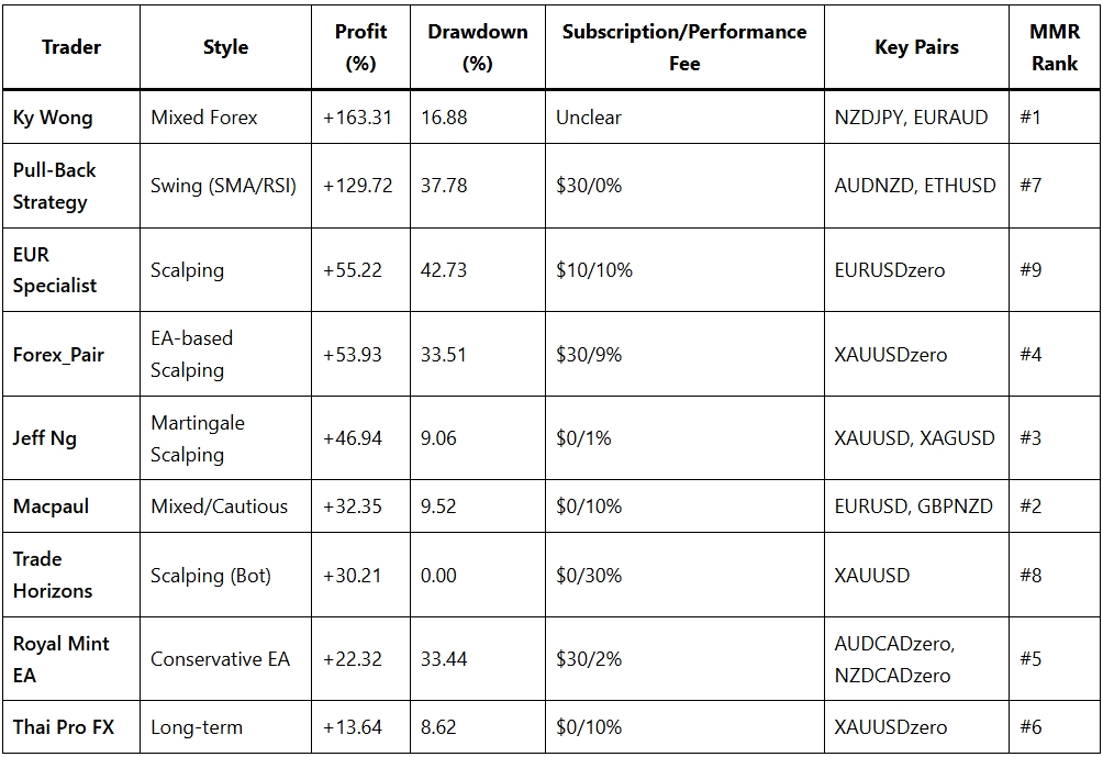 - Top performers: Ky Wong (+163%), Pull-Back Strategy (+129%), and Forex_Pair (+53%) lead in profitability, while Thai Pro FX offers lowest drawdown.