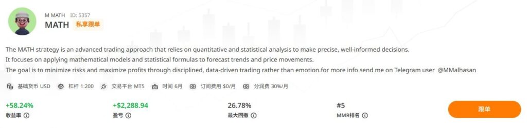 MATH信号附有详细的策略介绍,说明其交易决策依赖量化与统计分析,通过数据驱动完成每一笔操作,目标是在控制风险的前提下最大化利润。