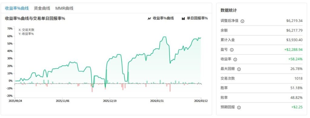 值得一提的是,MATH的卡玛比例虽然没有某些马丁格尔策略那样动辄10倍以上,但其优势恰恰在于策略结构的稳健性。由于盈亏比接近1:1,目前所记录的最大回撤具有较高的参考价值,能够较为真实地反映策略在正常市场环境下面临的实际风险。相比之下,马丁格尔策略在平稳阶段往往呈现出极高的卡玛比例,但一旦遭遇连续亏损,回撤可能在极短时间内急剧扩大,甚至直接导致爆仓,使此前亮眼的数据失去意义。