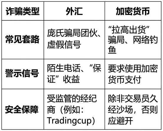 - 加密货币的拉高抛售盛行;外汇骗局则依赖虚假信号 。