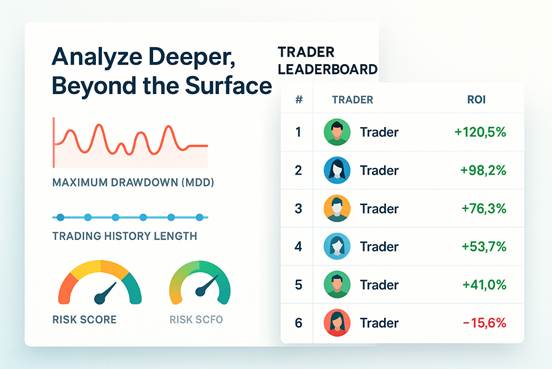 高ROI数字极具诱惑力,但它并不能说明全部问题。您需要理解其计算周期、方法以及背后所承担的风险水平。某些平台或交易者使用的计算方式可能会人为地夸大回报率。要深入挖掘,寻找夏普比率(Sharpe Ratio)等风险调整后回报指标,并了解交易者的典型风险敞口和杠杆使用情况 。