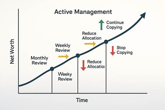 许多人误以为跟单交易是“设置好就不用管”的被动收入。事实并非如此。市场状况在变,交易者的表现也会波动。您需要定期跟踪和审查所跟单的带单者以及您的整体投资组合表现,以便及时做出调整。