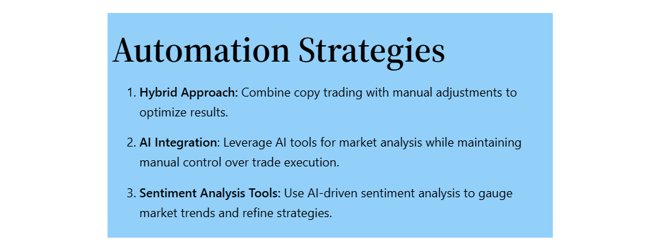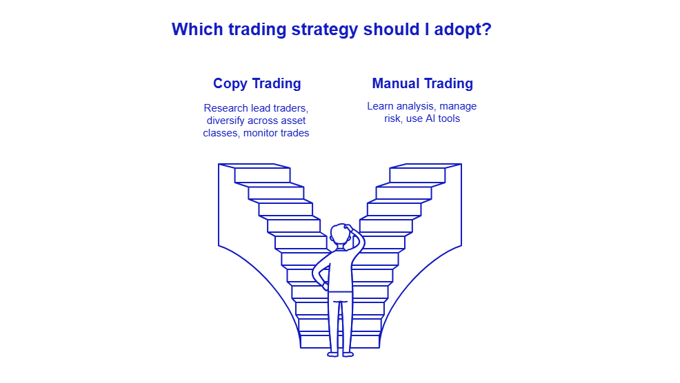 Weigh your goals, experience, and risk tolerance to choose the best method. Boost success with strategies like researching top traders for copying or using AI tools for manual analysis. Seasoned pros often blend both in a hybrid approach for optimal results. Want to master your trading journey?