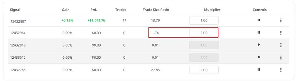 • Conversely, if you set the Signal Multiplier to 0.5, the Trade Size Ratio will be half the funds proportion (i.e., 5 * 0.5 = 2.5).