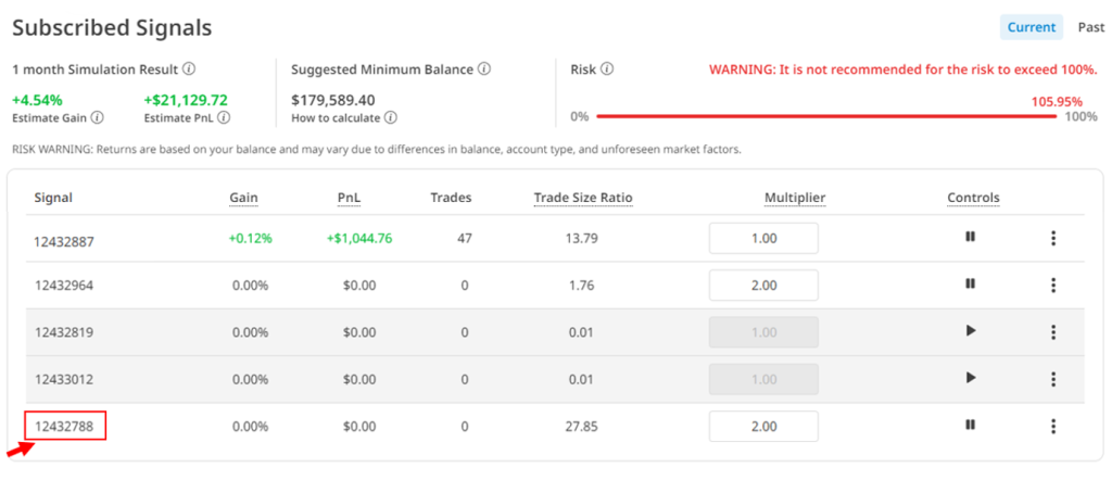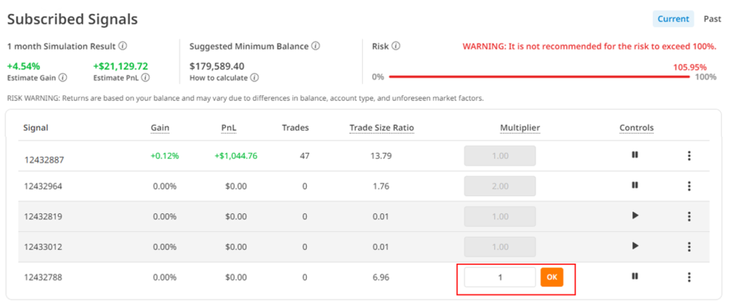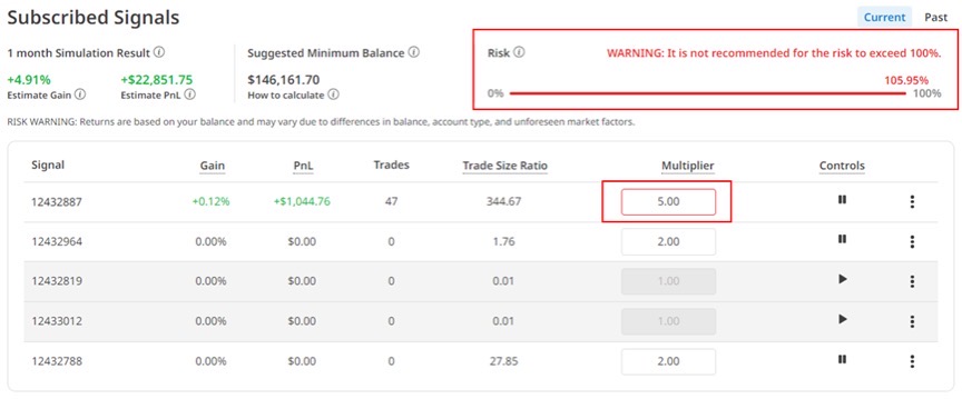• If you are copying multiple signals from the same trader or using the same strategy, the portfolio will lose its risk diversification, and the actual risk could be higher than shown in the “Risk” column.