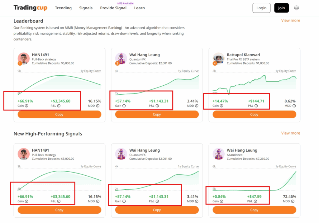 At Tradingcup, you can browse through a selection of signals and review past performance before you decide to copy.