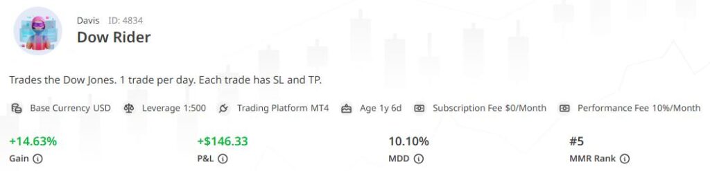 This figure may not sound impressive at first glance, yet it helped trader Davis’s Dow Rider signal break into the Top 5 of the Tradingcup leaderboard in just one year of operation.