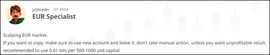 - Cautious Risk Management: The fact that both his maximum and minimum lot sizes are 0.01 demonstrates that EUR Specialist consistently trades with small positions to match his capital size, balancing risk and return effectively.