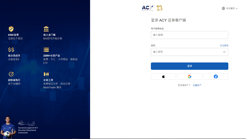 然后使用各位创建ACY证券账户时的电子邮件和密码进行登录。