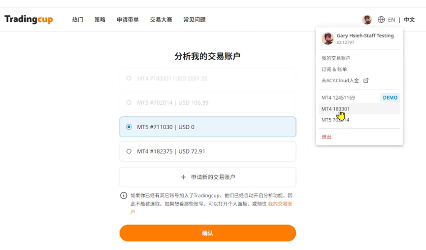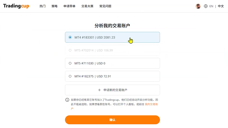 接着会出现可以选择用来分析的真仓账号,选中想分析的账户并按下确认。