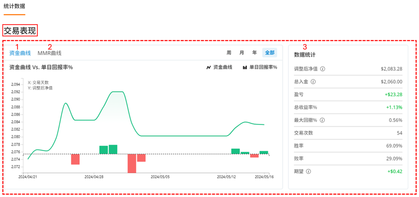 这边可以很直观的看到账户资金曲线变化(标示1),能够越平稳的往右上角走,就代表你能在兼顾风险的情况下,做到稳定获利。