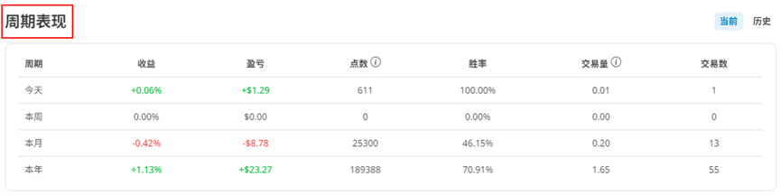 各位能一眼知道今年、这个月,这周还有今天的表现情况,像这里我就能知道这个月目前的收益率是负的,而且胜率跟过去相比也来得比较低一些,这样我就可以去回顾自己的交易,看看是因为情绪的关系还是自己分析的关系导致交易状况不如预期。