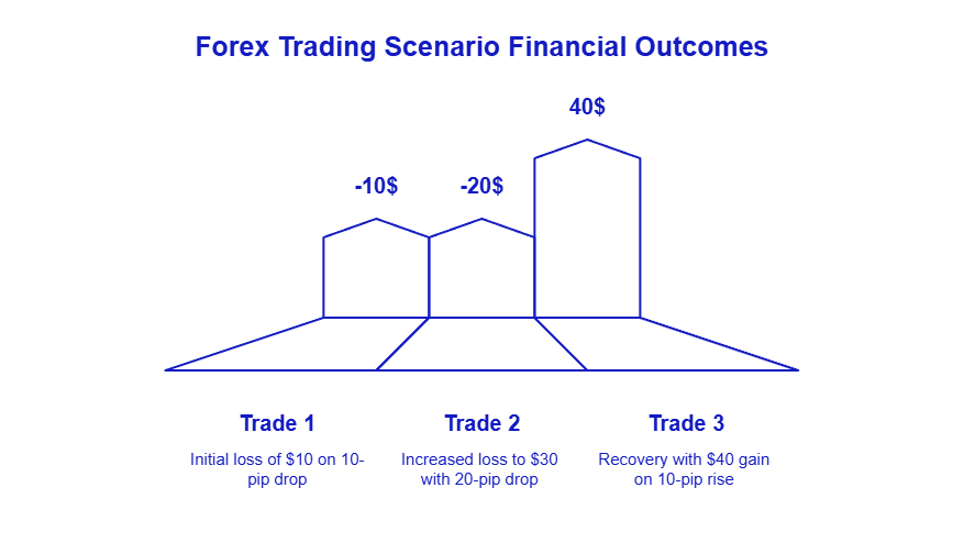 - Trade 2: You double your position to 0.2 lot and buy at 1.0990. The price falls to 1.0980 (another 10-pip loss), costing you $20 (0.2 lot * 10 pips * $1/pip). Total losses: $30.