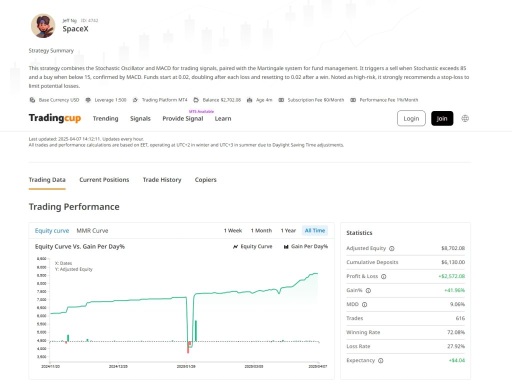 - Style: High-risk strategy combining Stochastic Oscillator and MACD indicators with the Martingale system for fund management.