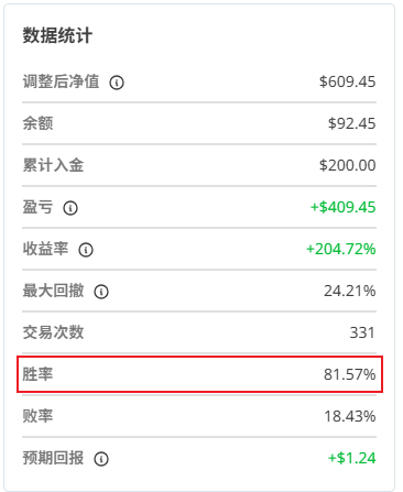 如前所述,超短线策略通常以“高胜率”来弥补“低盈亏比”。FreedomFlow通过频繁赚取微薄的利润点来覆盖偶尔的止损。这要求系统必须长期保持在极高的胜率水平(如目前的81%以上)。如果市场陷入长期的无序跳空,导致胜率自然回落,其净值曲线可能会经历一定程度的盘整或回撤(当前最大回撤为24.21%) 。