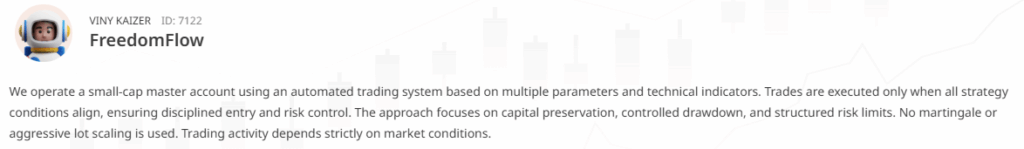 根据交易记录,其最大单笔开仓达到了 0.15手 。这意味着FreedomFlow具备“动态仓位调整”能力——在胜算最大的时刻集中火力以最大化利润 。但这同时也提醒跟单者,您的账户需要保留一定的可用资金,以承接这种因高概率信号而触发的仓位放大。
