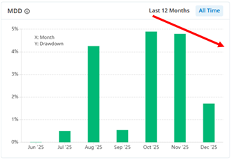 Even more noteworthy is that over the past three months (October–December 2025), the maximum drawdown has declined month by month, indicating improving stability. In December, the maximum drawdown was only 1.71%, with almost no capital retracement this is the key reason the equity curve has been able to rise steadily. For long-term copiers, this level of risk control is often far more attractive than short-term high returns.