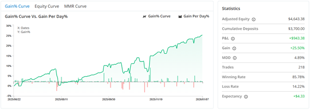 - Exceptional Performance Metrics: It boasts an impressive 85% win rate and has maintained a maximum drawdown below 5%, showcasing elite risk management.