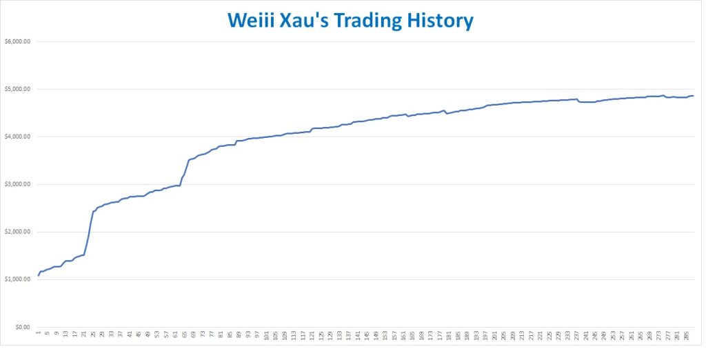 Weiii Xau has grown his portfolio from a starting balance of $1,079 to $4,855.99. An estimated increase of 350.05%.