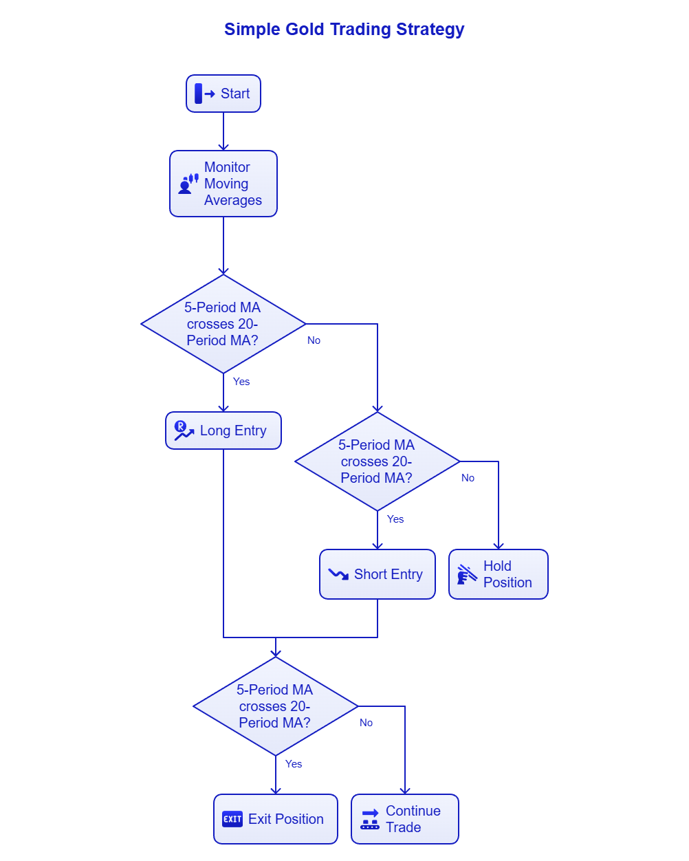 • A long entry is triggered when the 5-period MA crosses above the 20-period MA.