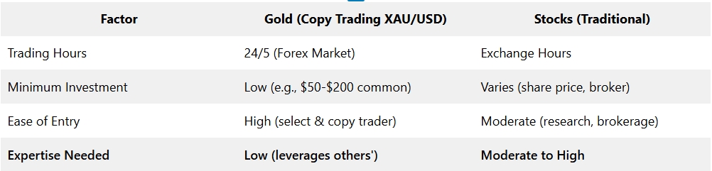 • Cost & Accessibility Edge: Forex copy trading offers lower hidden fees and easier access with smaller capital than the often-complex fee structures and higher stock entry points.