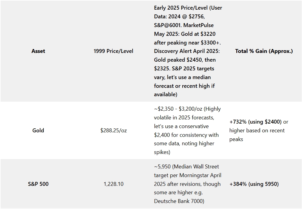 Observation: Even with S&P 500’s continued growth, gold’s surge, especially post-2020 and into the volatile 2024-2025 period, keeps its long-term performance competitive, particularly on a risk-adjusted basis during certain periods. The $2,756 from user data for 2024 was already a strong performance. If forecasts of $3000+ gold (like Goldman Sachs’ $3,700 per Discovery Alert) materialize consistently, gold’s long-term gain would be even more pronounced.