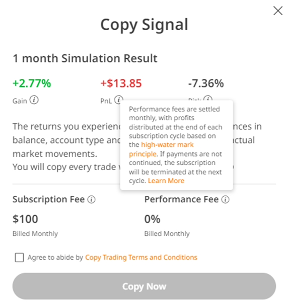 - Month 1: The copy trader earns a $300 profit, setting a new high water mark. A 20% performance fee is charged on the $300 profit, resulting in a $60 fee.