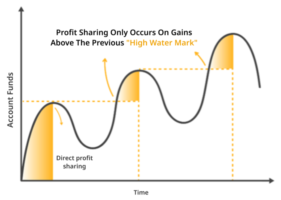 The image below illustrates the concept of profit sharing based on the ‘High Water Mark’ principle, where profits are shared only on gains that exceed the previous peak account value.