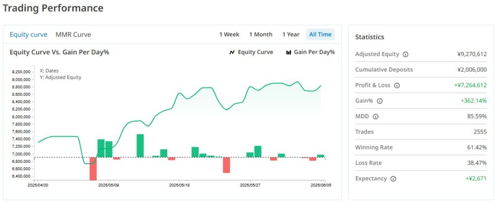 - Stellar Returns: The trading account has achieved a phenomenal 356.29% return, generating over 7.14 million yen in total profit. This demonstrates impressive profitability for this aggressive strategy.