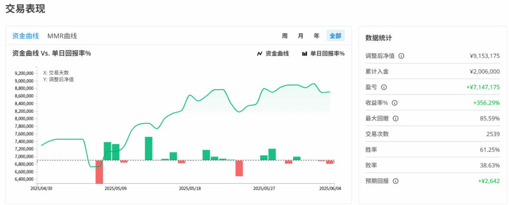 • 然而,其最大回撤率高达85.59%,意味着账户资金在峰值到谷底时曾经历巨大缩水,表明策略的的不稳定性和高风险性。
