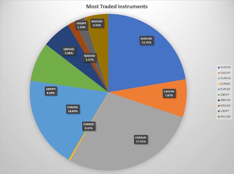 His best-performing instrument is EURAUD, while the worst is GBPJPY. Trading multiple instruments allows for increased probability, varied risk exposure, and flexibility across different markets.