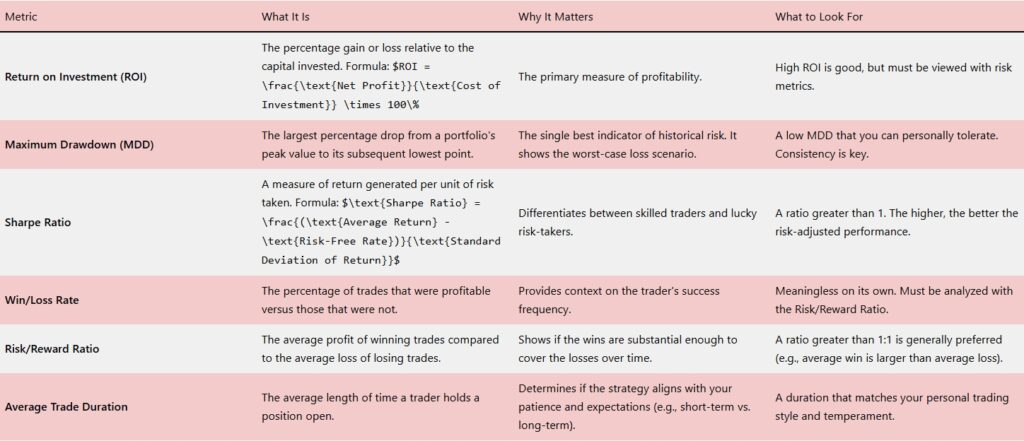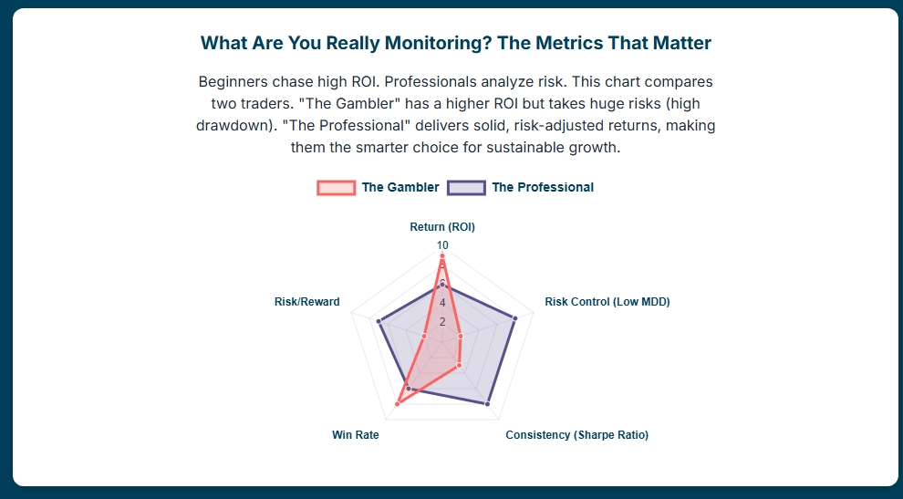 Most beginners make the mistake of focusing solely on the “Total Profit” or “ROI” figure. This is a vanity metric that tells you nothing about the journey taken to achieve it. A 100% return is meaningless if it came with a 90% drawdown that would have wiped out most investors. To truly understand a trader’s skill and risk profile, you must look under the hood at the metrics that matter. Think of these metrics as telling the story of the trader’s discipline and strategy. To get a full picture, it’s essential to learn how to read a trader’s performance data correctly.