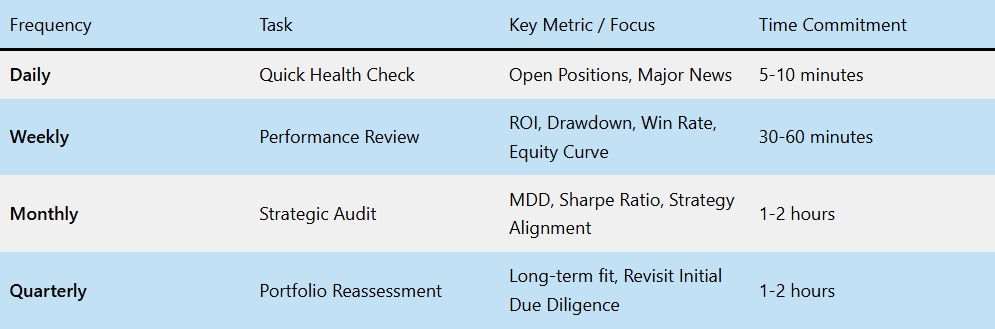 - Conduct Periodic Reviews, Not Constant Scrutiny (Checking on the Business): Buffett does not watch the daily stock ticker. He periodically reviews the fundamental performance of his companies to ensure they are still sound investments. Your weekly and monthly monitoring sessions are your “quarterly earnings calls” with your chosen trader. You are not worried about the daily stock price (P&L); you are assessing if the business fundamentals (their core metrics like MDD, risk management, and strategy adherence) remain intact.