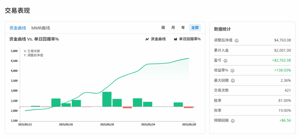 • 最大回撤:仅为2.36%,即便在波动剧烈的市场环境下,也能有效控制风险,保障账户的持续稳健运作。