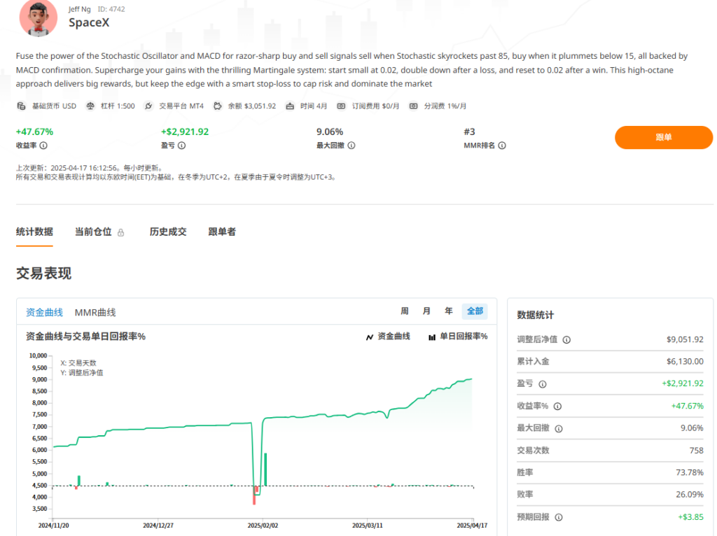 交易风格: SpaceX 采用结合随机指标(Stochastic Oscillator)和 MACD 指标的技术策略。其交易方法是在随机指标超卖至 85 时买入,跌至 15 以下时卖出,同时确认 MACD 信号。他还采用了“激进的马丁格尔系统”进行仓位管理。