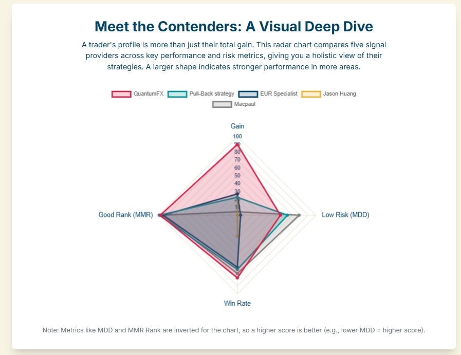 To move from theory to practice, let’s analyze five real-world signal providers available on the TradingCup platform. These traders represent a diverse range of strategies, risk appetites, and performance histories. They will serve as our case studies for the remainder of this guide. Instead of looking at their profiles in isolation, a professional approach demands a direct, side-by-side comparison of their most critical metrics.
