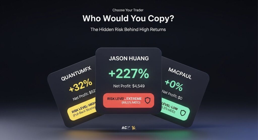 This analysis immediately reveals a critical insight. The trader with the most spectacular monthly return, Jason Huang, also carries the highest risk, as indicated by his enormous Maximum Drawdown (MDD) and low win rate. Conversely, the most conservative trader, Macpaul, preserved capital but generated no profit this month. This highlights the fundamental trade-off in investing: risk and reward are inextricably linked. The “best” trader is not simply the one with the highest gain; it is the one whose risk profile most closely aligns with your own.