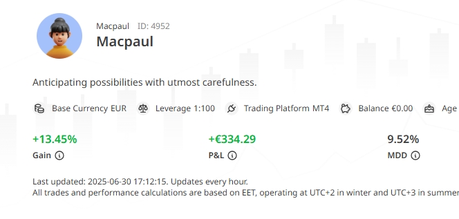 | Macpaul | $2,000 | 0.00% | $0.00 | 10% | $0.00 | $0.00 | Most conservative with lowest MDD (9.52%). Base currency is EUR, introducing currency risk. |