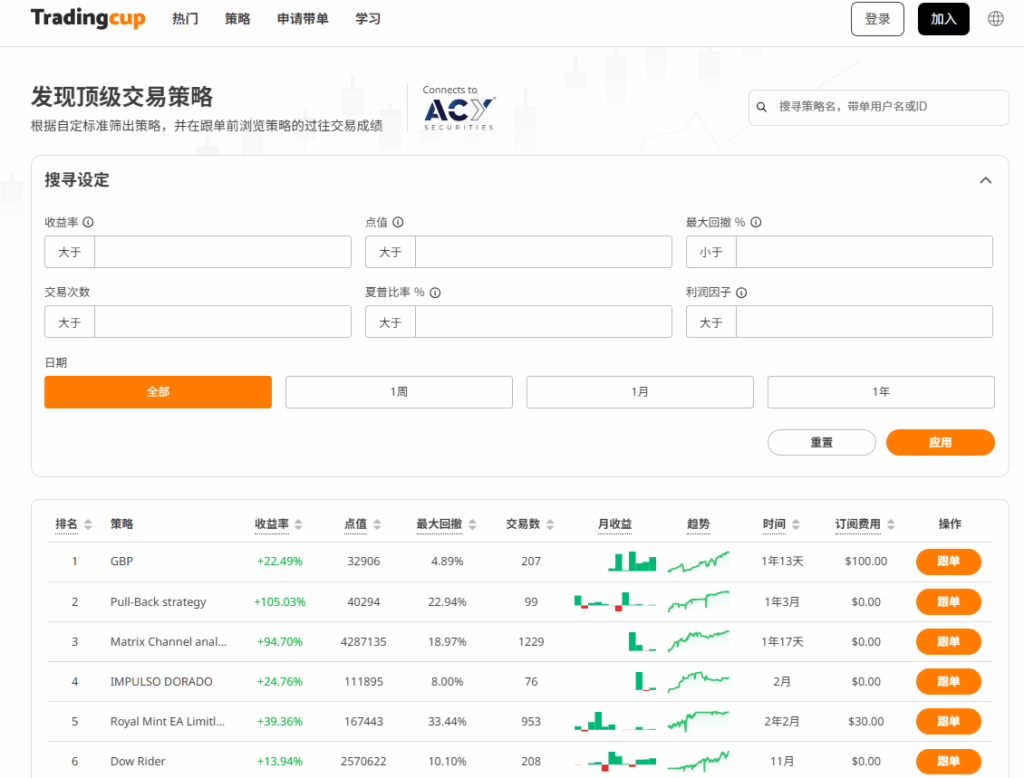 Tradingcup交易杯与 ACY 证券的 MT4 和 MT5 平台实现了无缝集成。你需要将你的经纪商账户链接到Tradingcup,这是启用“跟单”功能的关键一步,相当于给你的账户装上了一个“接收器”。