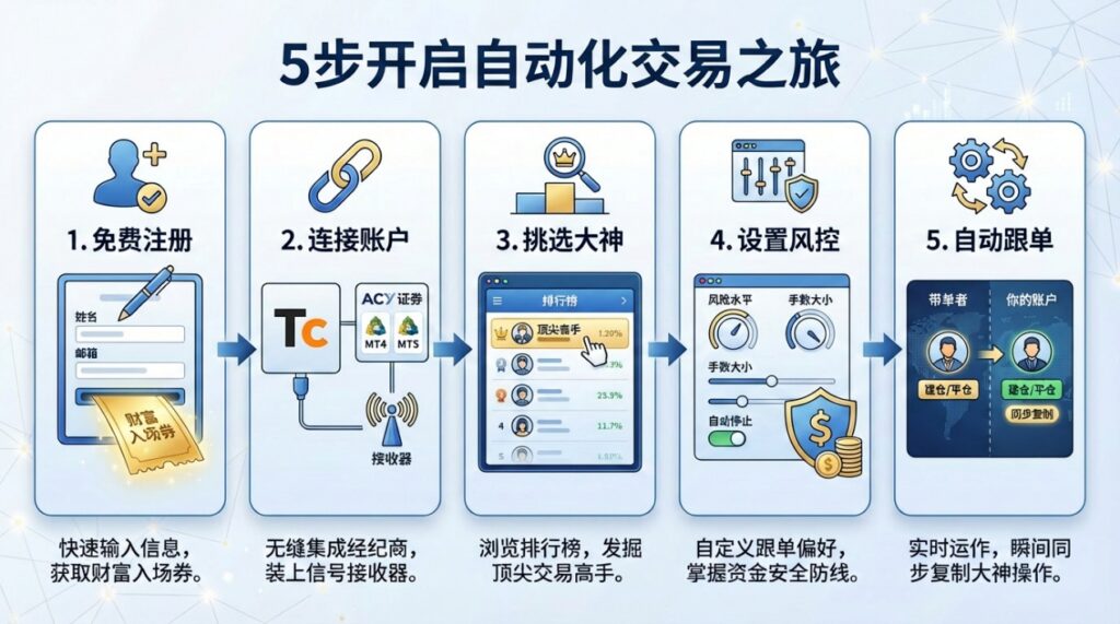 说了这么多,具体该怎么操作呢?其实非常简单,只需要以下5个步骤,你就能完成从注册到自动盈利的全过程。