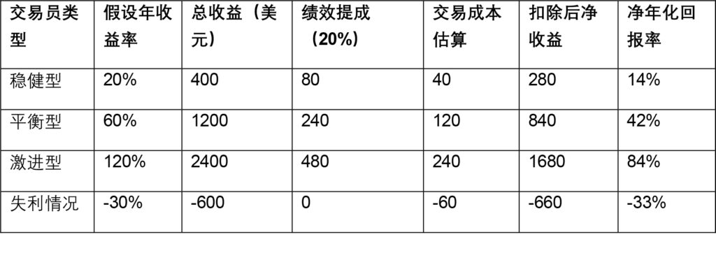 假设你打算投入2000美元进行跟单交易。我们来看看可能出现的几种年化收益情况(数据为假设性模拟):