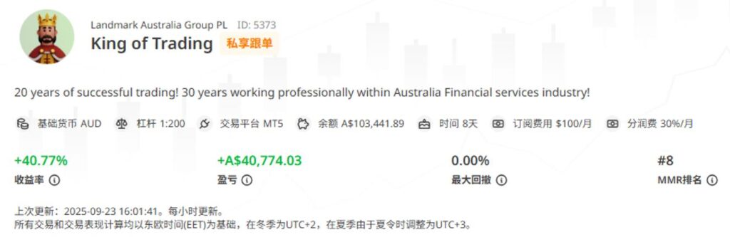 短短6个交易日,这个名为 King of Trading的王者信号便以543笔交易、近98%的惊人胜率,豪取40%的超高回报,一举冲上排行榜第八名! 关键,这并非小资金尝试,而是以10万澳元资金进行的实盘操作。所有交易记录在Tradingcup官网实时更新,可随时查验。正因为资金规模较大、透明度高,他的成绩具有更强的参考意义,也因此吸引了多位交易者跟单,并在此过程中创造了可观的盈利。
