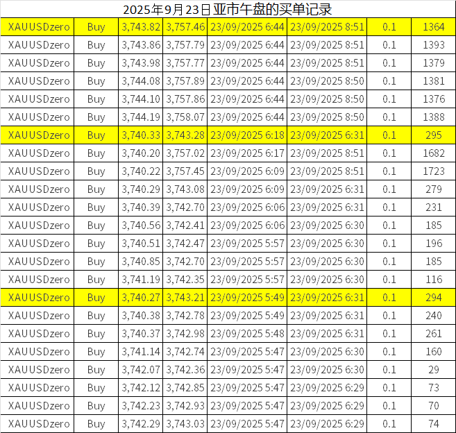 为了验证这个比值,我们就以最新的9月23日亚市午盘的买单作为例子。从价格和时间点分析,交易者分别三次进行整体建仓,手数分别为0.8、0.9、0.6,很明显不是马丁策略的等比加仓。