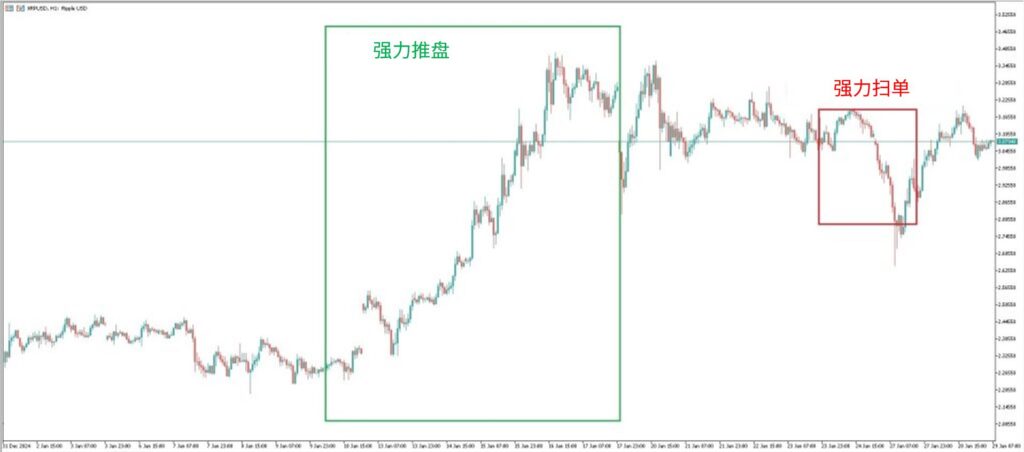 在不同周期的图表中,两者甚至可能同时出现。例如,在周线图中出现一次明显的清扫动作,但在4小时图中则表现为一次强劲的推进。