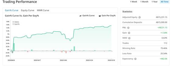One detail worth noting: although the standard lot size is 0.01, the position size increases significantly during drawdowns, with the largest trade reaching 0.25 lots. For an AUD 15,000 account, this is still relatively light, but structurally it has the clear characteristics of a Martingale system.