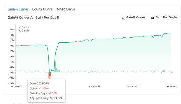 On September 10, Alpha’s short positions in both pairs suffered notable drawdowns, with floating losses expanding to 11.5% due to the Martingale scaling. However, once the market reversed on September 15, all losses were fully recovered.